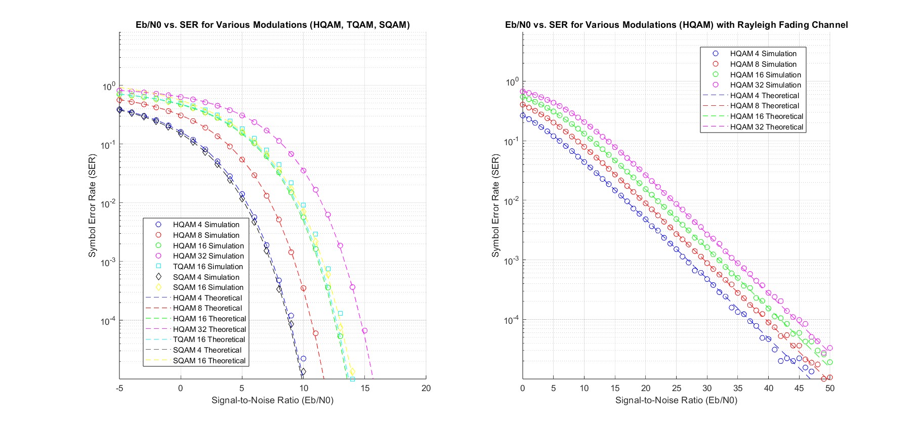 Accurate ASER estimation for HQAM under AWGN and Rayleigh fading conditions.